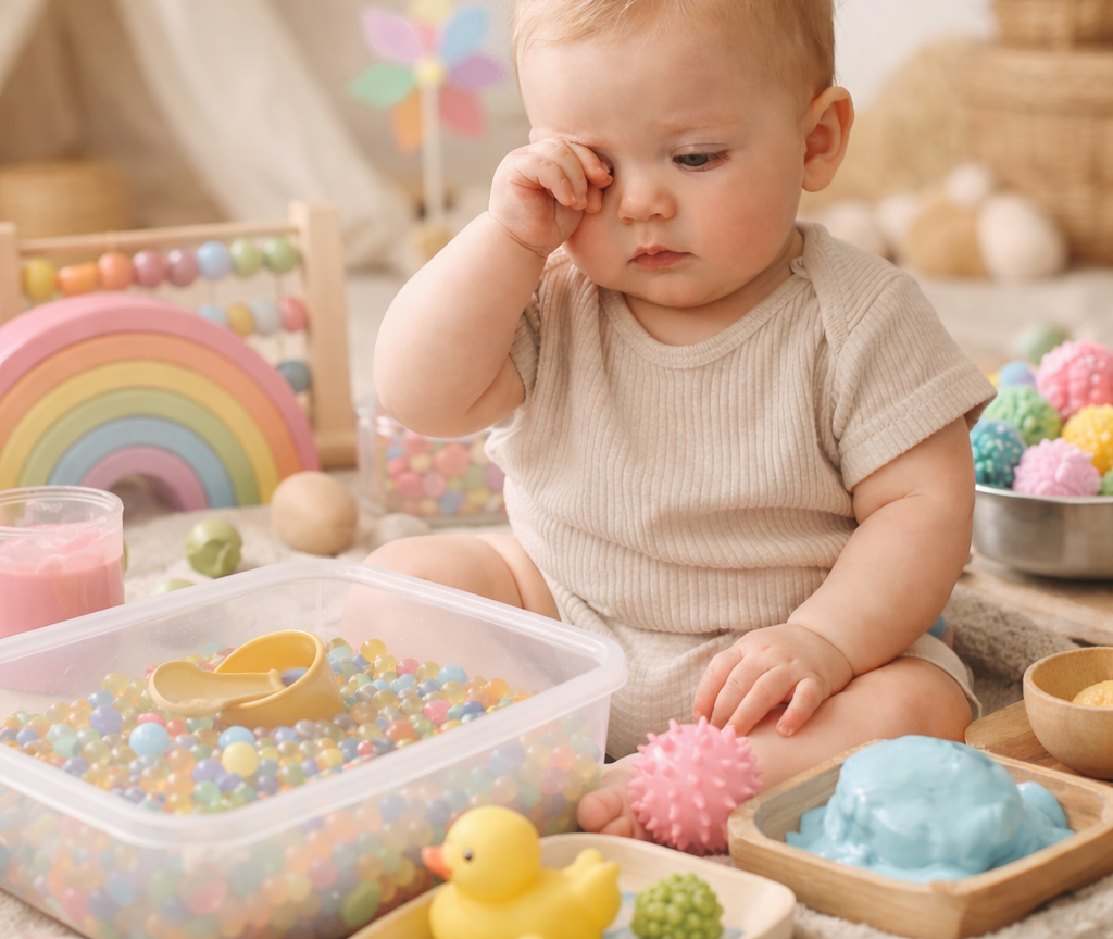 Diese Frage stellen sich viele Eltern früh – oft schon im ersten Lebenshalbjahr. Begriffe wie Sensory Play Baby, sensorisches Spielen ab 6 Monaten oder Förderung für Babys tauchen schnell auf. Dabei entsteht leicht der Eindruck,