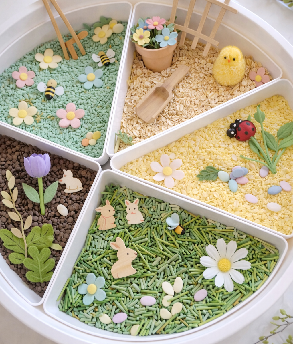 In diesem liebevoll gestalteten Sensory-Workshop tauchen die Kinder in eine frühlingshafte Gartenwelt ein. Drei unterschiedliche Fächer laden zum Schütten, Entdecken und Erkunden ein – mit verschiedenen Texturen, Farben und Naturmaterialien.