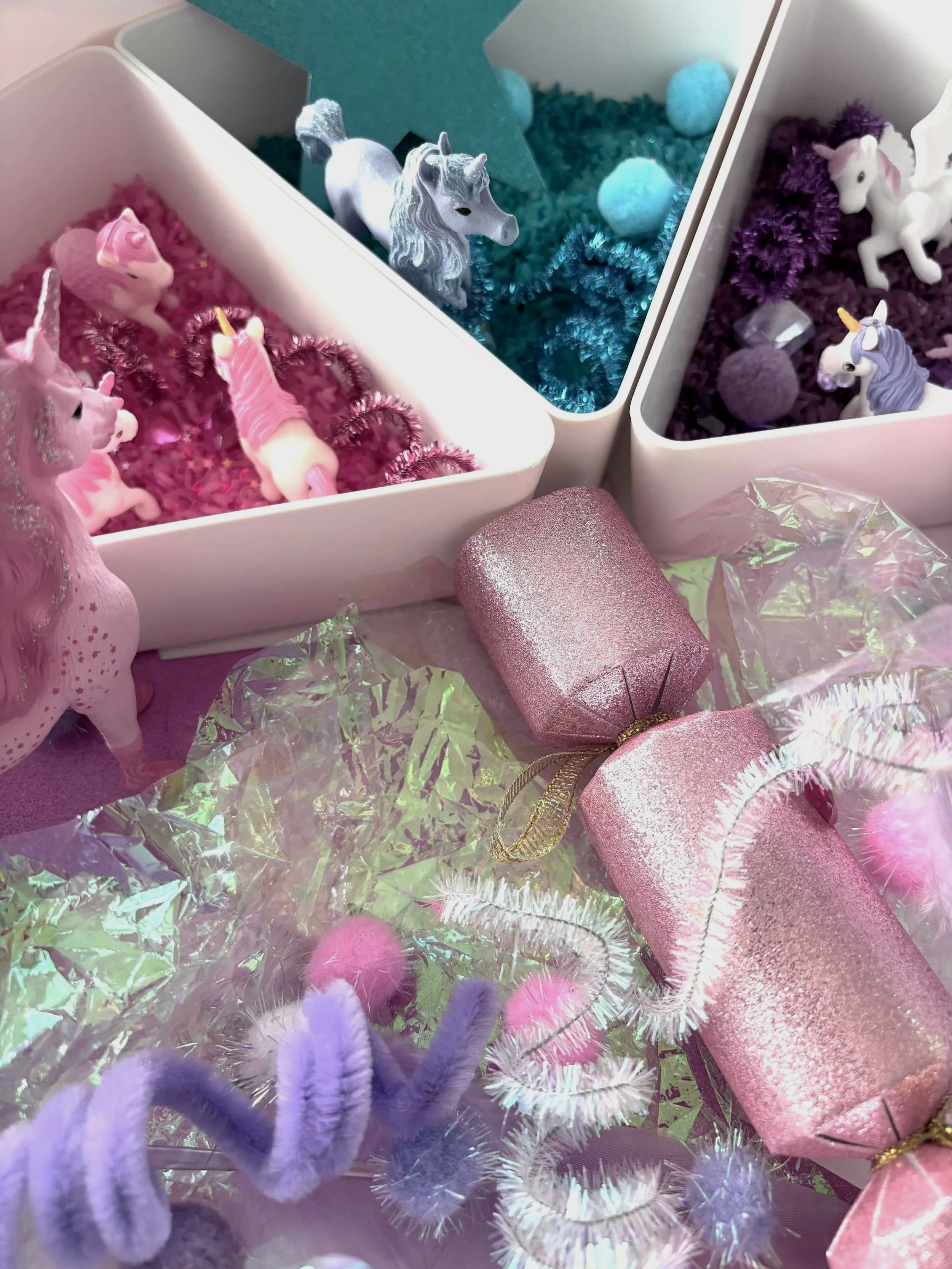 Die liebevoll gestaltete Sensory Box fördert spielerisch die Sinne, Fantasie und Kreativität. Ein magisches Sensory-Erlebnis voller Farben, Überraschungen und Einhornzauber.