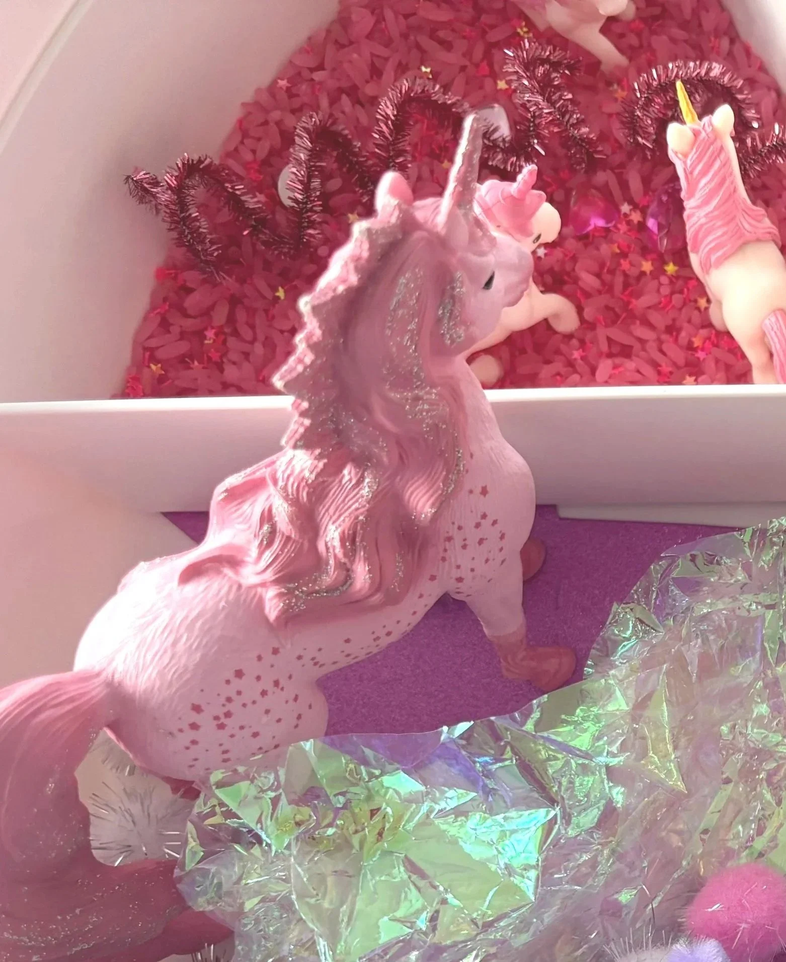 Sanfte Farben, weiche Texturen, funkelnde Materialien und kleine Einhörner laden zum Greifen, Tasten, Schütten und Staunen ein.