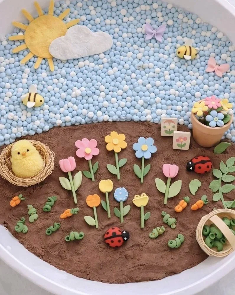 In diesem frühlingshaften Sensory-Workshop gestalten die Kinder ihre eigene kleine Gartenwelt. Unterschiedliche Materialien wie Erde, Reis oder strukturierte Füllelemente laden dazu ein, Landschaften zu formen, Blumen zu pflanzen und kreative Szenen entstehen zu lassen.
